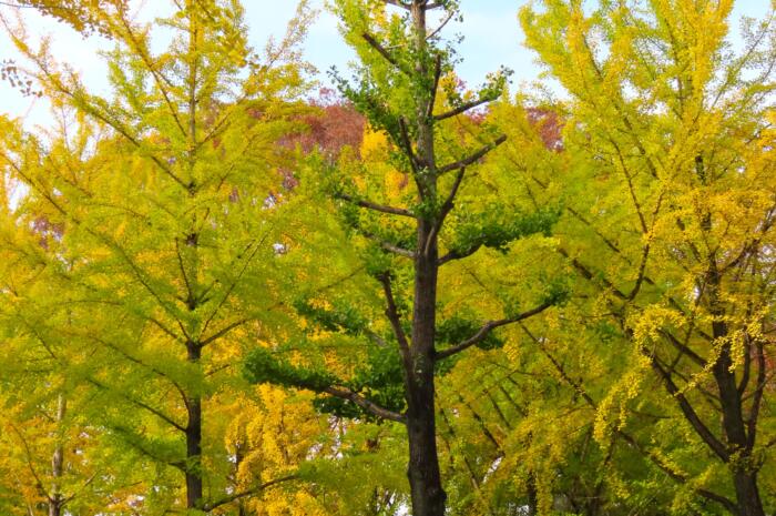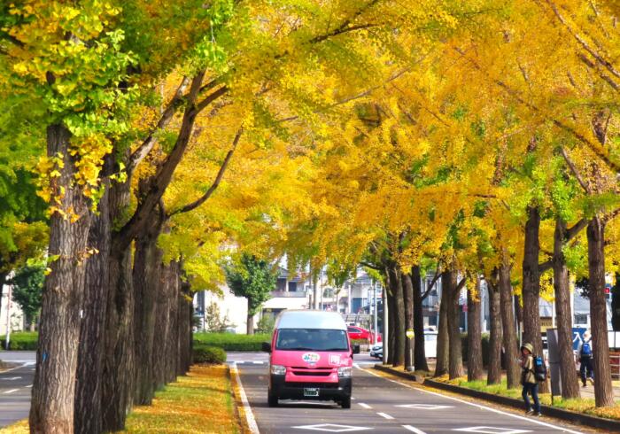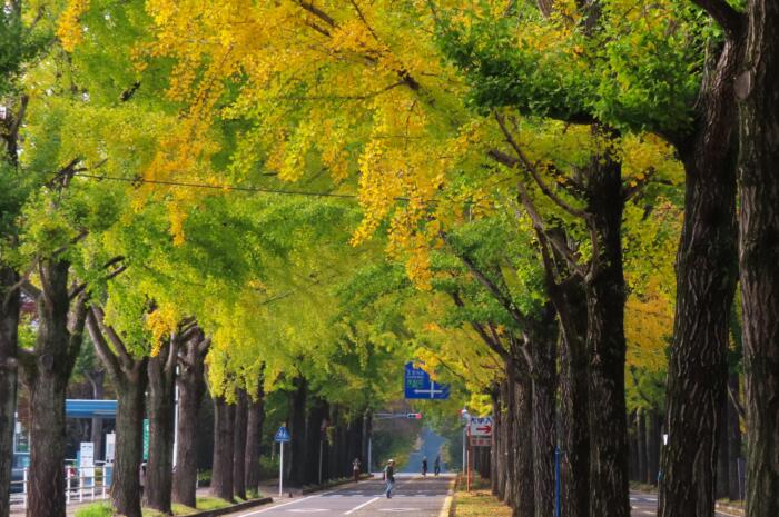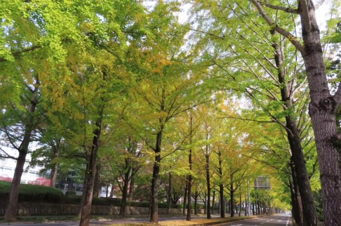 獨協医大前の通り約550mにわたり200本ほどのイチョウが植えられている「獨協銀杏並木」