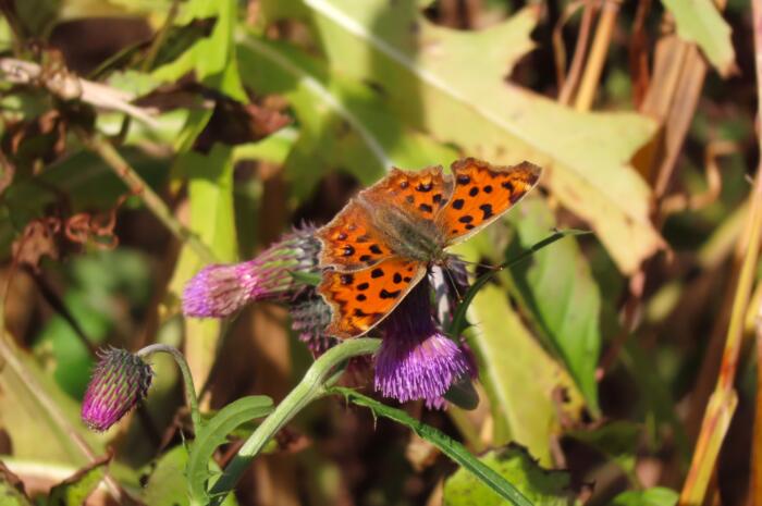 タカネアザミに蜜を吸いに来たヒョウモンチョウの仲間