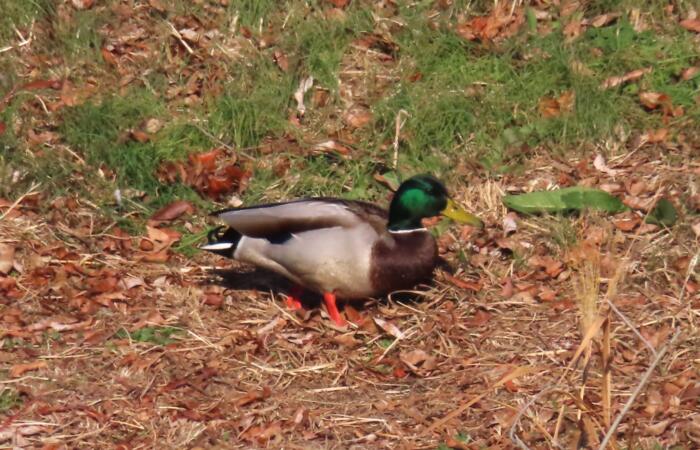 岸に上がり草芽などを食んでいる「マガモ」 (冬鳥)