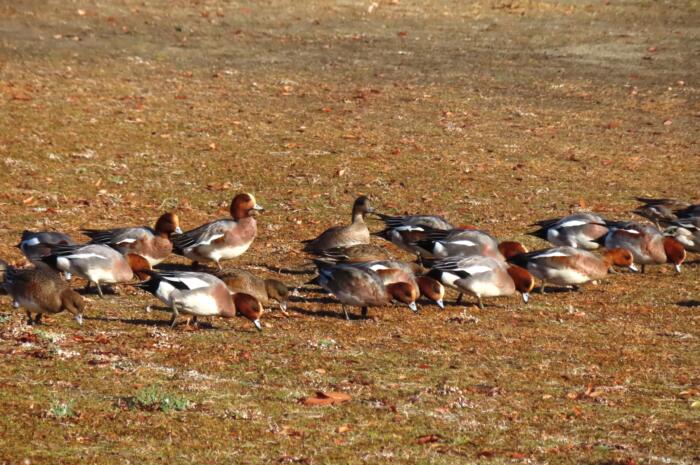 集団で岸に上がり草芽などを食んでいる「ヒドリガモ」