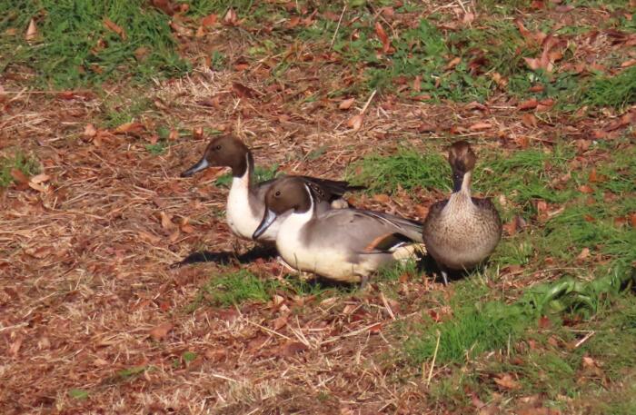 岸に上がって一休みしている「オナガガモ」 胸が白いのが雄です (冬鳥)