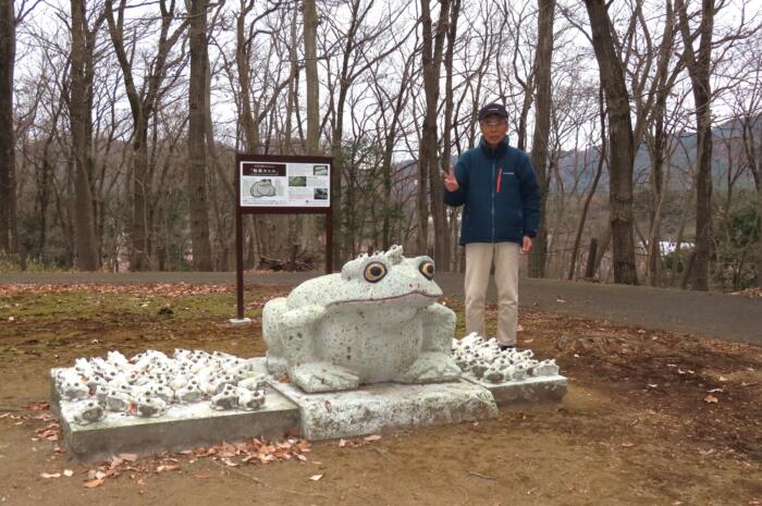 ろまんちっく村森のエリア山頂部にある大谷石製無事カエルと共に