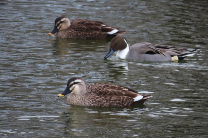 仲良く泳ぐカルガモとオナガガモ(真ん中)
