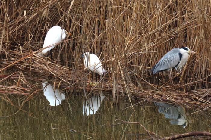 ヨシ原で餌を探す(左:ダイサギ) (真中:コサギ) (右:アオサギ)