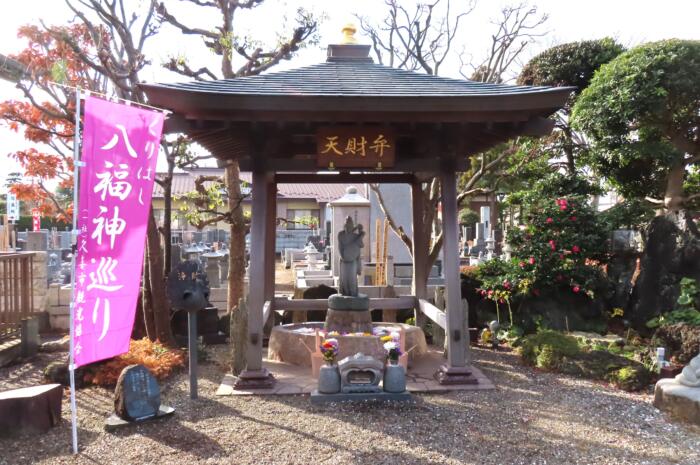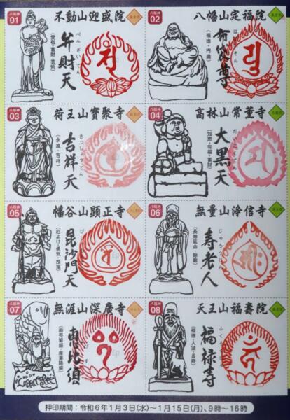 七福神巡りは「七難即滅(しちなんそくめつ)、七福即生(しちふくそくしょう)」するといわれ、室町時代にはじまり、江戸時代に広まりました。「七難即滅、七福即生」とは、「七つの大難はたちどころに消滅し、七つの福が生まれる」という意味で、七つの大難は、「太陽、星の異変、火災、水害、風害、旱害(かんがい)、盗難」のこととされています。この七福神に美・幸運・富の女神「吉祥天」を加えているのがくりはし八福神です。