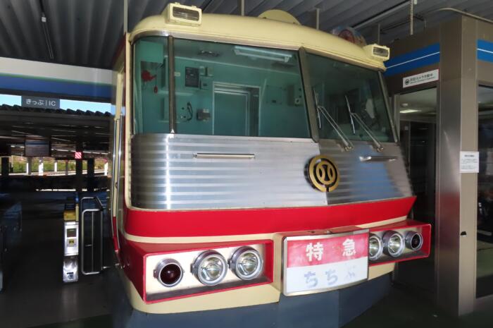 西武球場前駅に展示されている初期レッドアローの運転台カットモデル