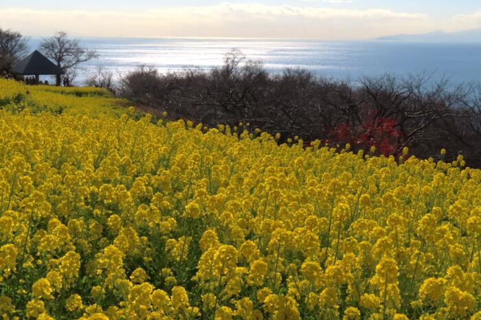 菜の花越しに輝く相模湾 右側には伊豆半島も見えます