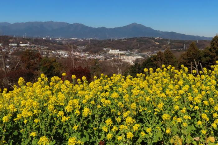 菜の花畑から大山をはじめとする丹沢山系を望む