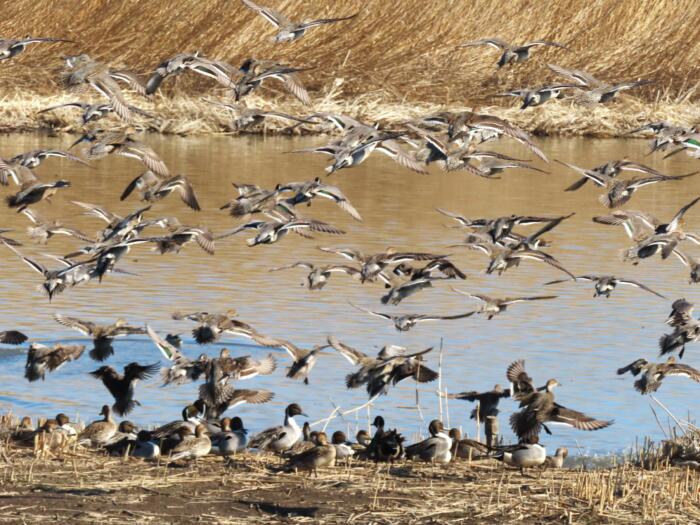 一斉に飛び立つオナガカモの集団