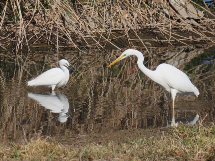 にらめっこする(右:ダイサギ) (左:コサギ)