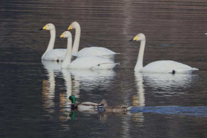 オオハクチョウと仲良く泳ぐマガモのカップル(手前)