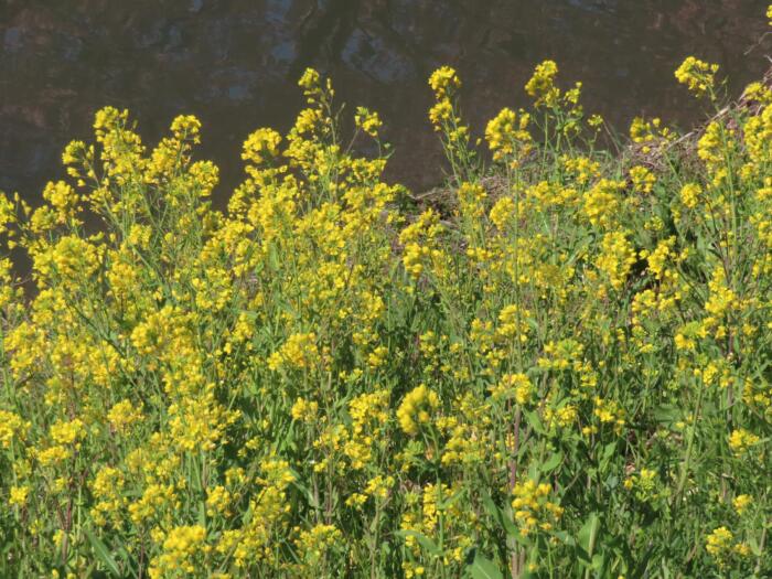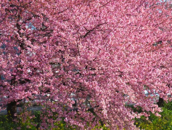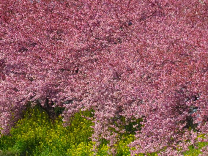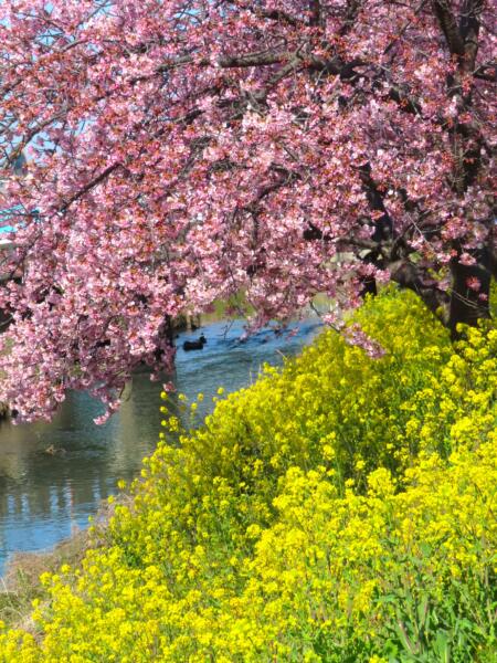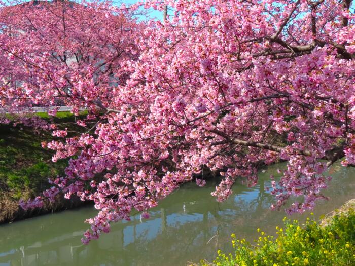 アイキャッチ画像は青毛堀川に沿って菜の花と共に咲き誇る河津桜