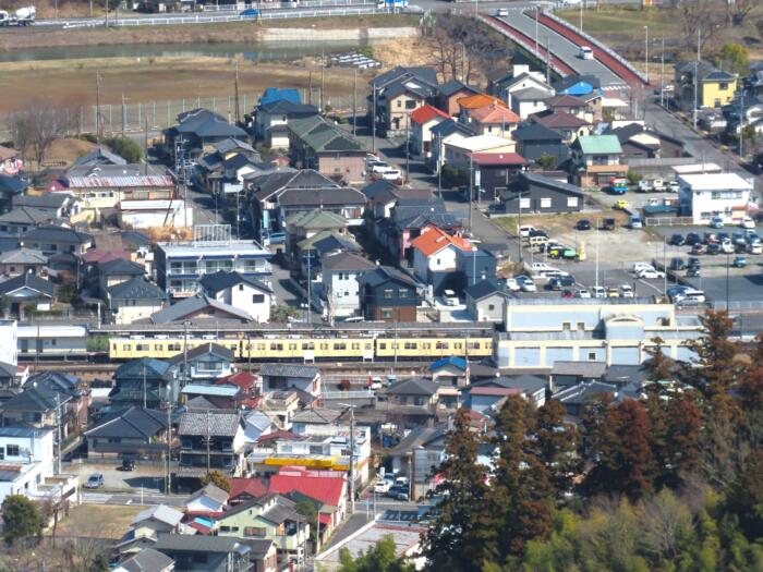 西山高取よりホームに電車が止まっている越生駅を望む