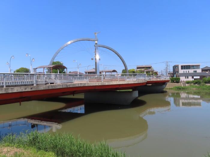 古利根川の景観を楽しむことができる「古利根公園橋」麦わら帽子をコンセプトとしたモニュメントがポイントです
