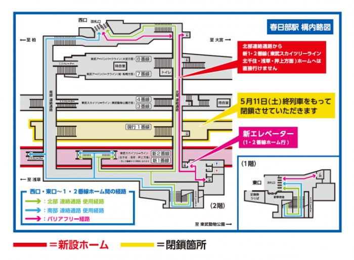 春日部駅高架化工事の進捗に伴い、2024年5月12日(日曜日)初列車より、東武伊勢崎線上り(北千住・浅草・押上方面)仮上りホームの供用を開始いたします。なお、このことに合わせ、各連絡通路から仮上りホームへの経路が変更となります。(下図参照)伊勢崎線仮上り線のホームへは、北春日部寄りの連絡通路から階段で降りることはできません。
