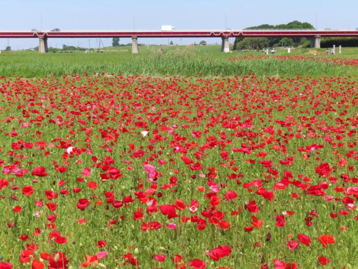 鴻巣市で開かれている花まつりのポピーが見頃を迎えて来たので馬室会場(ポピー・ハッピースクエア)へお花見に行って来ました、馬室会場は川幅日本一の荒川の河川敷に日本一広いポピー畑が約12.5haあり、約3000万本の赤やオレンジ色等様々なポピーが咲き誇る広大な場所になります、現在は7分咲位で週明けに満開を迎えると思います、花まつりはその他に吹上会場・川里会場もあります。