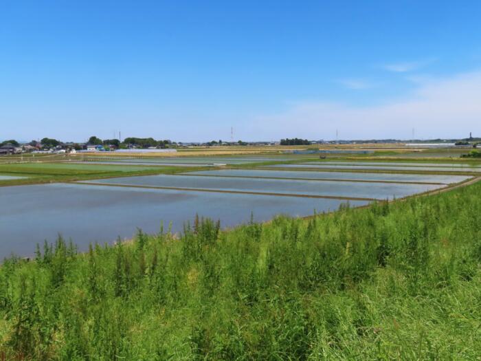 田植えが終わった小山市生井地区の田園風景 冬場は日光方面の山並みが美しく見えます