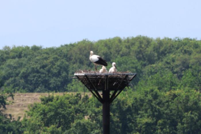 アイキャッチ画像は人工巣塔の上で親鳥に甘えている三羽のヒナたち