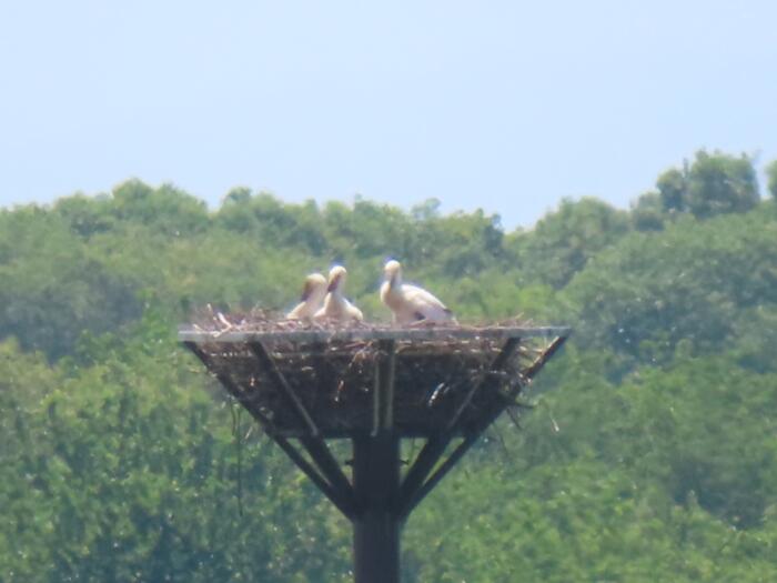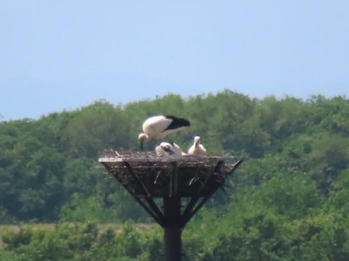 小山市生井地区の渡良瀬遊水地に設置されているコウノトリ用人工巣塔に定着している7歳の雄「ひかる」と、4歳の雌「レイ」の三羽のヒナが順調に成長しており久しぶりに観察に行って来ました、来月早々には巣立ちを迎えると思います。写真は望遠で撮っていますので画像が乱れてます事をご容赦下さい、因みにコウノトリは国の特別天然記念物に指定されています。