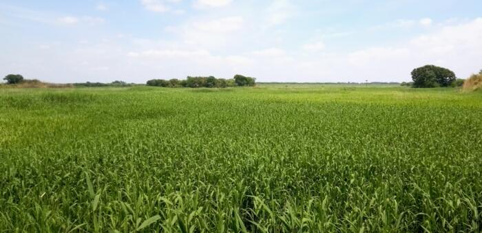 野焼き後に順調に生育している調整池のオギ