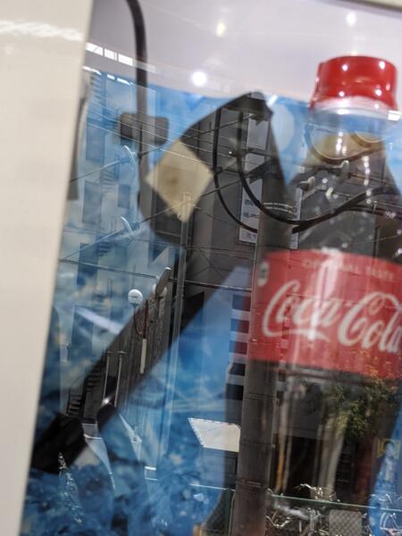 以外に見ない 自販機の見本のところの 破壊シーン! 考えてみれば 何も無いエリアだから 何かありようが無いですね 多分、こんなのはじめてです、 なんか酔っ払って 傾いてるやつを コーラが支えて…