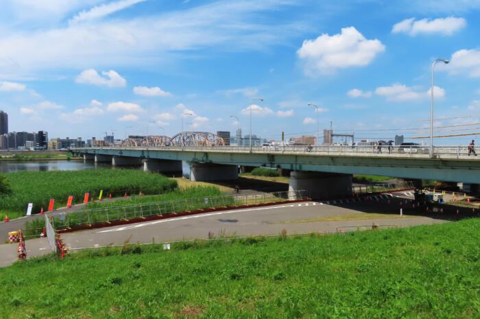 足立区柳原と葛飾区堀切の間の荒川(荒川放水路)と葛飾区の綾瀬川に架かる「堀切橋」奥には京成線の鉄橋も架かっています