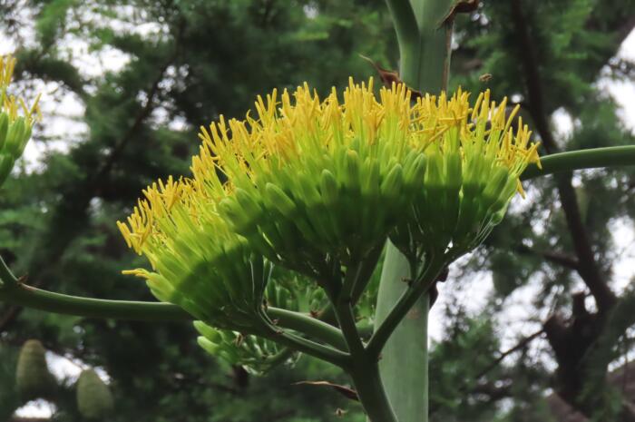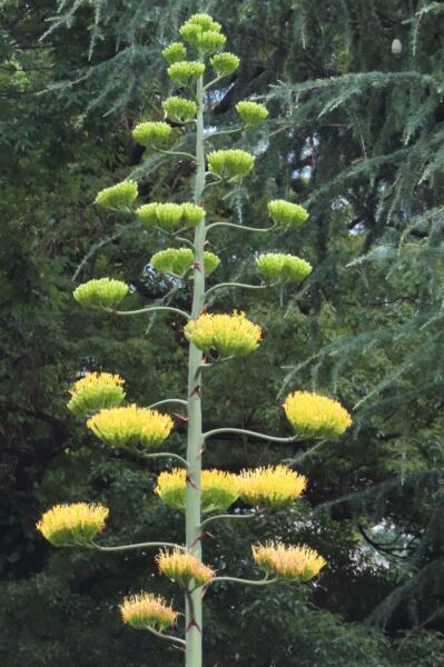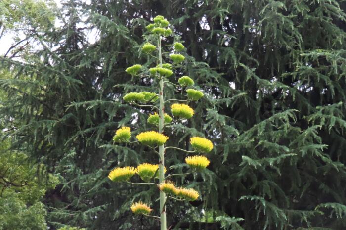 アイキャッチ画像は園内花壇の右奥に樹木のようにそそり立って咲くアオノリュウゼツラン