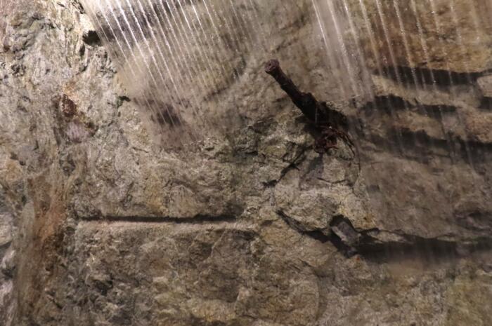 とんねる削岩当時の痕跡が至る所に残っています 黒い棒は削岩機の棒が折れた状態