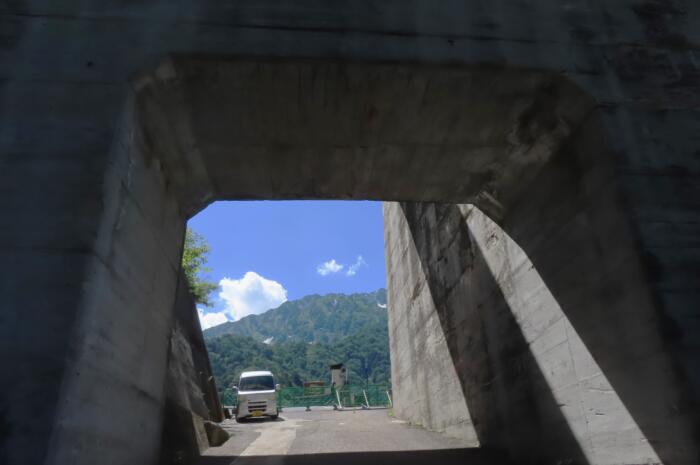 ダム建設当時コンクリートバケットを操縦するために造られたコンクリート製建造物をくぐる