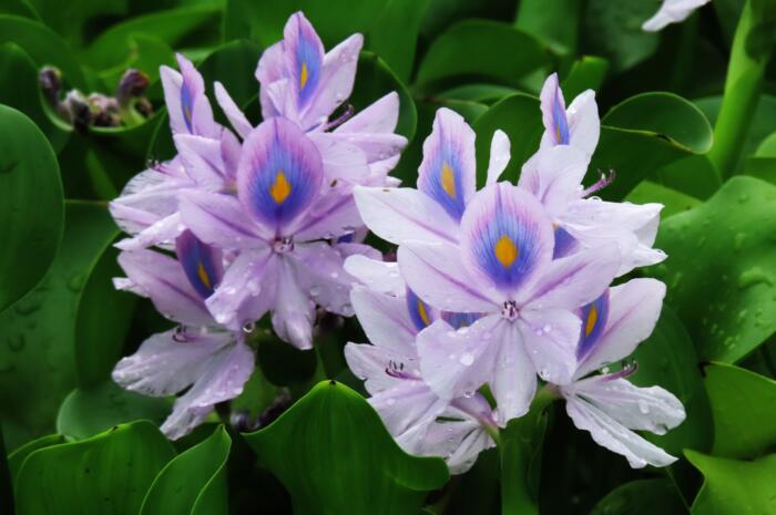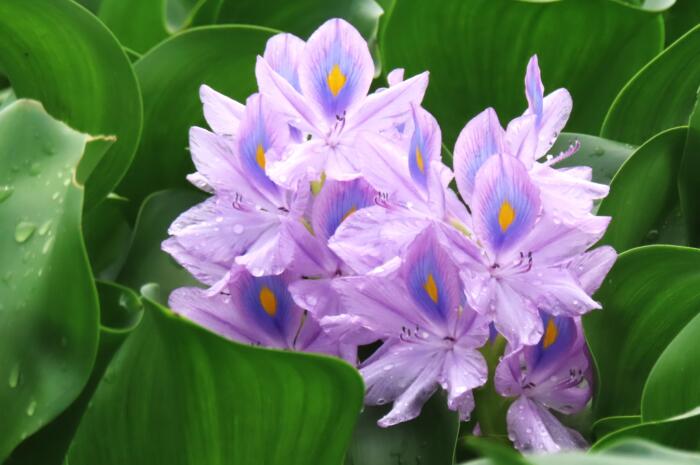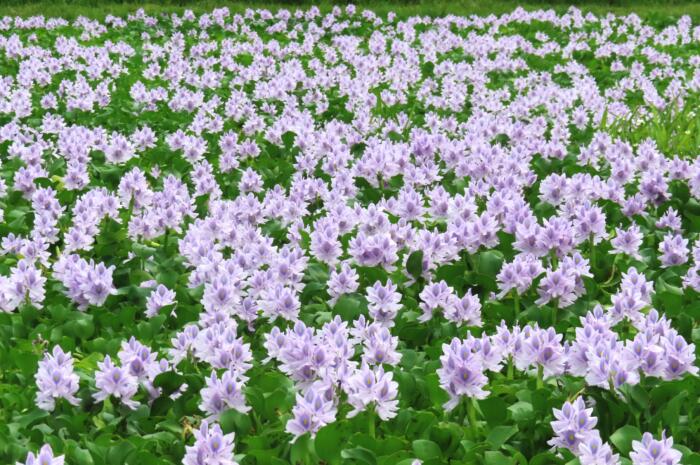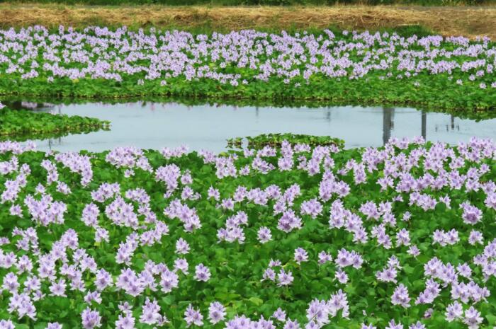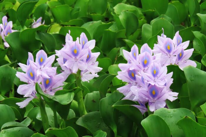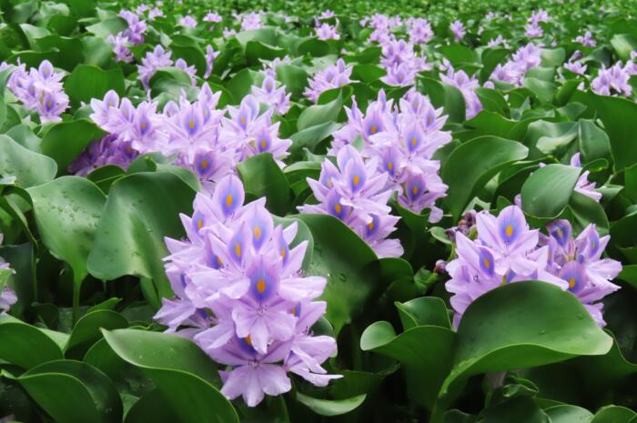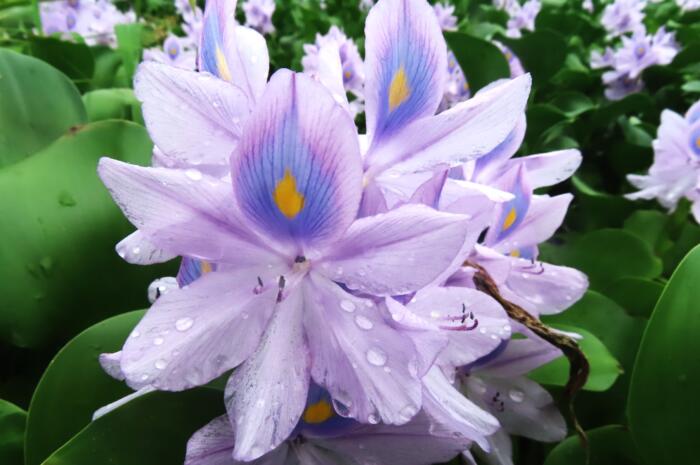 ホテイアオイ(布袋葵)は、ミズアオイ科に属する水草で、南アメリカ原産で水面に浮かんで生育します、元々は観賞用,家畜飼料として導入されましたが、花が青く美しいので最近は観賞用が主になります、別名ホテイソウー、ウォーターヒヤシンスと言われています、観賞用の他に、水質浄化・緑肥に利用される事もあります、次々に咲きますので9月頃まで見頃が続きます。