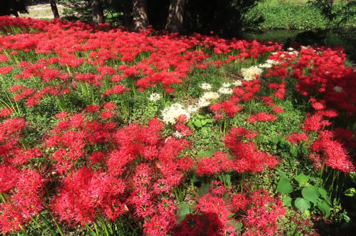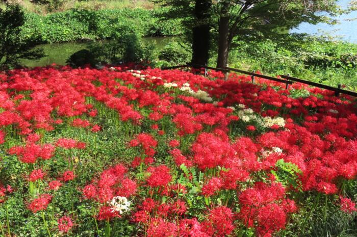 アイキャッチ画像は咲き誇る彼岸花越しに権現沼が望める離山公園