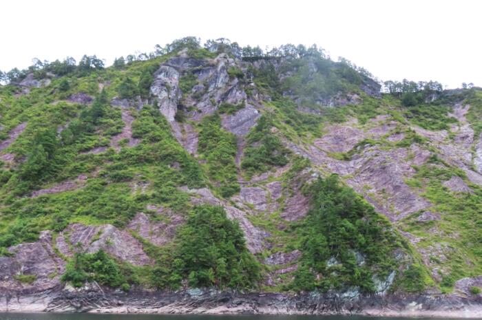 遊覧船から福島県側にそそり立つ「虚空蔵岩」を望む