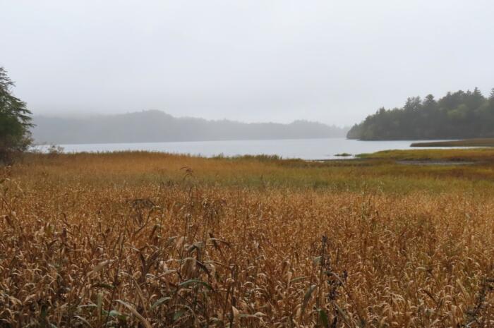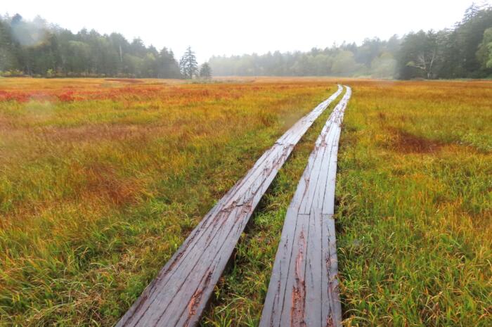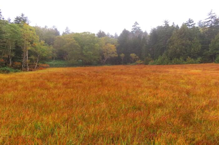 草紅葉で萌える大江湿原のシンボル的存在の「三本唐松」
