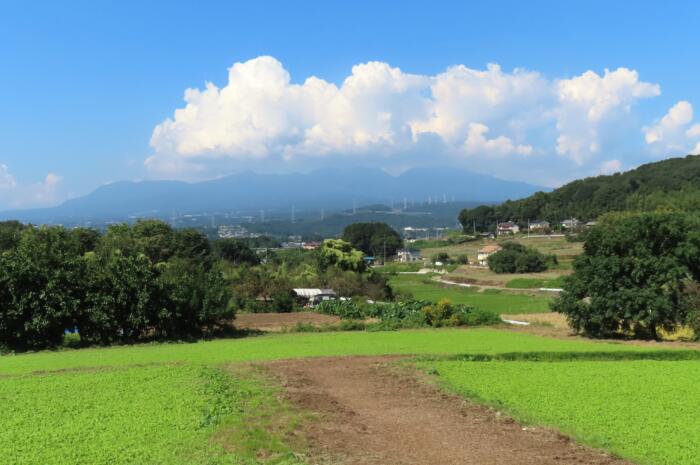 鹿田山フットパス田園地区から雲に隠れる 赤城山を望む