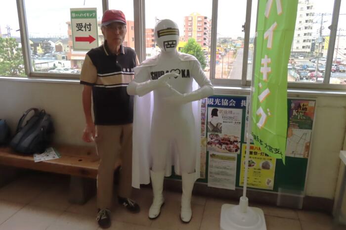 受付で出迎えてくれた白岡市を愛する「シラオ仮面」と記念写真