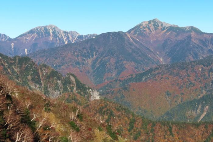 龍王岳山頂より鬼岳2750m・赤牛岳2864・左奥には槍ヶ岳3180mも見えます