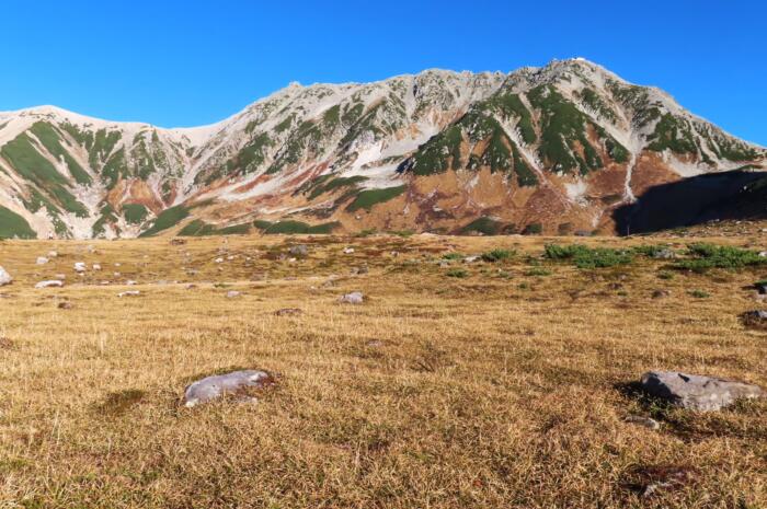 五色が原(約2450m)越しに北アルプスの女王と言われる「薬師岳2926m」と左奥の「水晶岳2986m」を望みます
