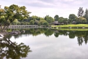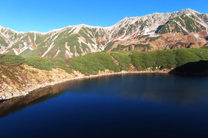 青空を映す「みくりが池」越しに立山3015m(雄山)を望みます