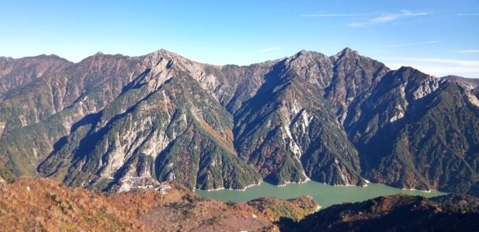 大観峰から黒部ダム及び黒部湖から後立山連峰を望む 右から針ノ木岳・スバリ岳。赤沢岳