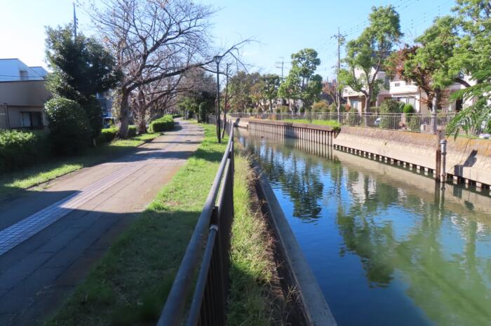 新方川に沿って桜並木と共に整備されている「新方川緑道」