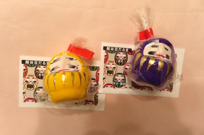 駅からハイキング参加記念で頂い「越谷豆だるま」右:長寿 左:金運です