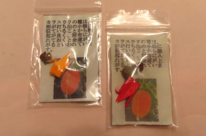 カラスウリの種が打ち出の小鎚似ている処から金運守りとして越谷アリタキ植物入園記念で頂きました