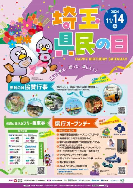 2024.11.12 事務局 akasaka 11月14日埼玉県民の日 11月14日は埼玉県民の日です、この日に合わせて様々な施設で特典がありますの良かったら活用して下さい。 埼玉県作成県民の日チラシ 各施設別の得点については下記埼玉県庁のホームページで確認できます 県庁オープンデー – 埼玉県 県民の日協賛行事一覧(PDF:5,659KB)(別ウィンドウで開きます) 4 件のコメント 県民の日! 体調にもよりますが 大宮に。定点観測に 行こうかと思います! 人が多いのかな! 返信する 大宮に電車で行く時は春日部駅の窓口で県民の日キップ(480円)を購入して行って下さい、乗降り自由でお得ですよ 返信する 無事県民の日キップ買えました! 東口だけなんですね 現金だけの扱いなんですね 知らなかった! 前に、親子連れがいまして やはり、県民の日キップを 買ってました! ありがとうございますm(_ _)m 返信する ありがとうございますm(_ _)m 明日は、そうします\(°o°)/ 返信する コメントを残す コメントをキャンセルメールアドレスが公開されることはありません。 ※ が付いている欄は必須項目ですコメント ※ 名前 メール サイト 次回のコメントで使用するためブラウザーに自分の名前、メールアドレス、サイトを保存する。