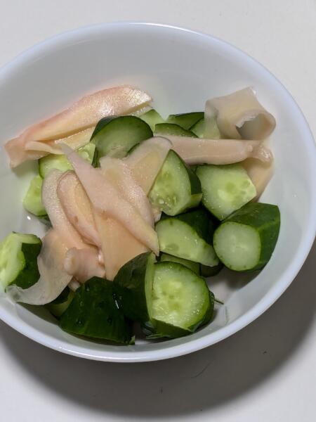 キュウリにガリを混ぜただけですが イイ感じのツマミです キュウリの甘酢掛けの酢の物に ピリッとガリが アクセントに!! 試してみてください!