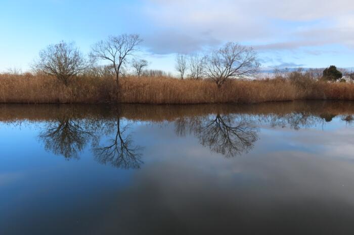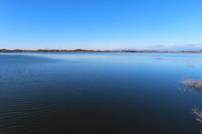 昼過ぎの快晴の空を映す谷中湖