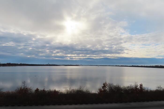 朝の薄曇りを映す谷中湖