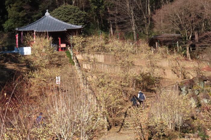 行基の作と伝わる十一面千手観音を収める観音堂を囲むように咲き誇る蝋梅