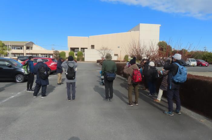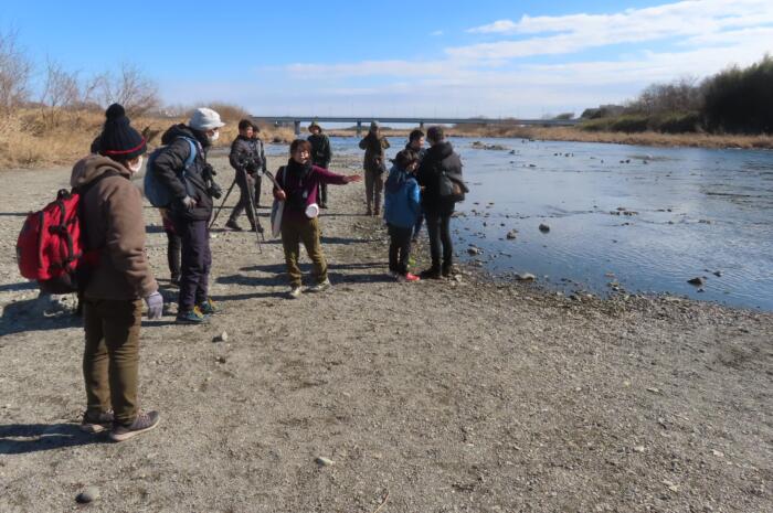川本白鳥飛来地にて観察のポイントについて講師から案内