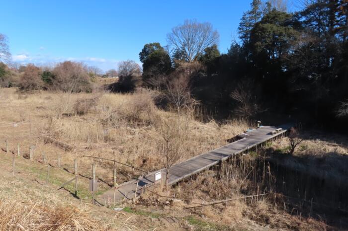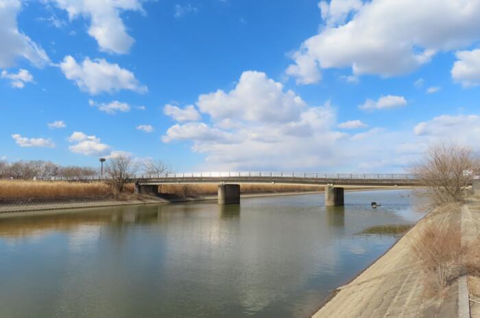 遊水地内を流れる池内水路に架かる「東谷中橋」渡った先が谷中湖になります