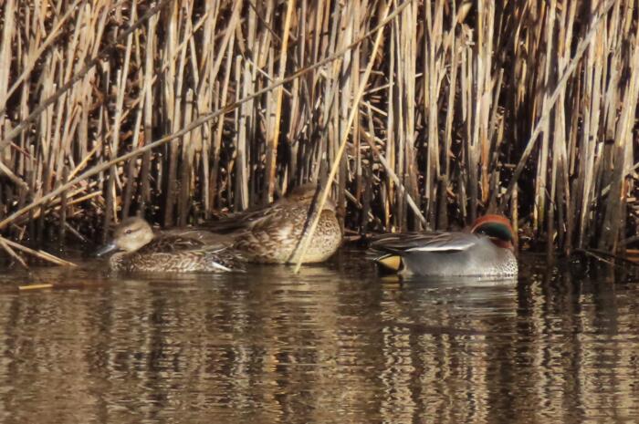 ヨシ原で強風を避けているコガモ達